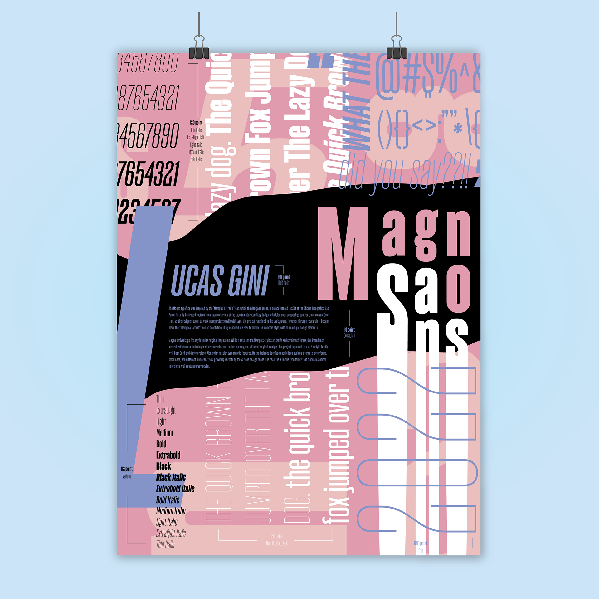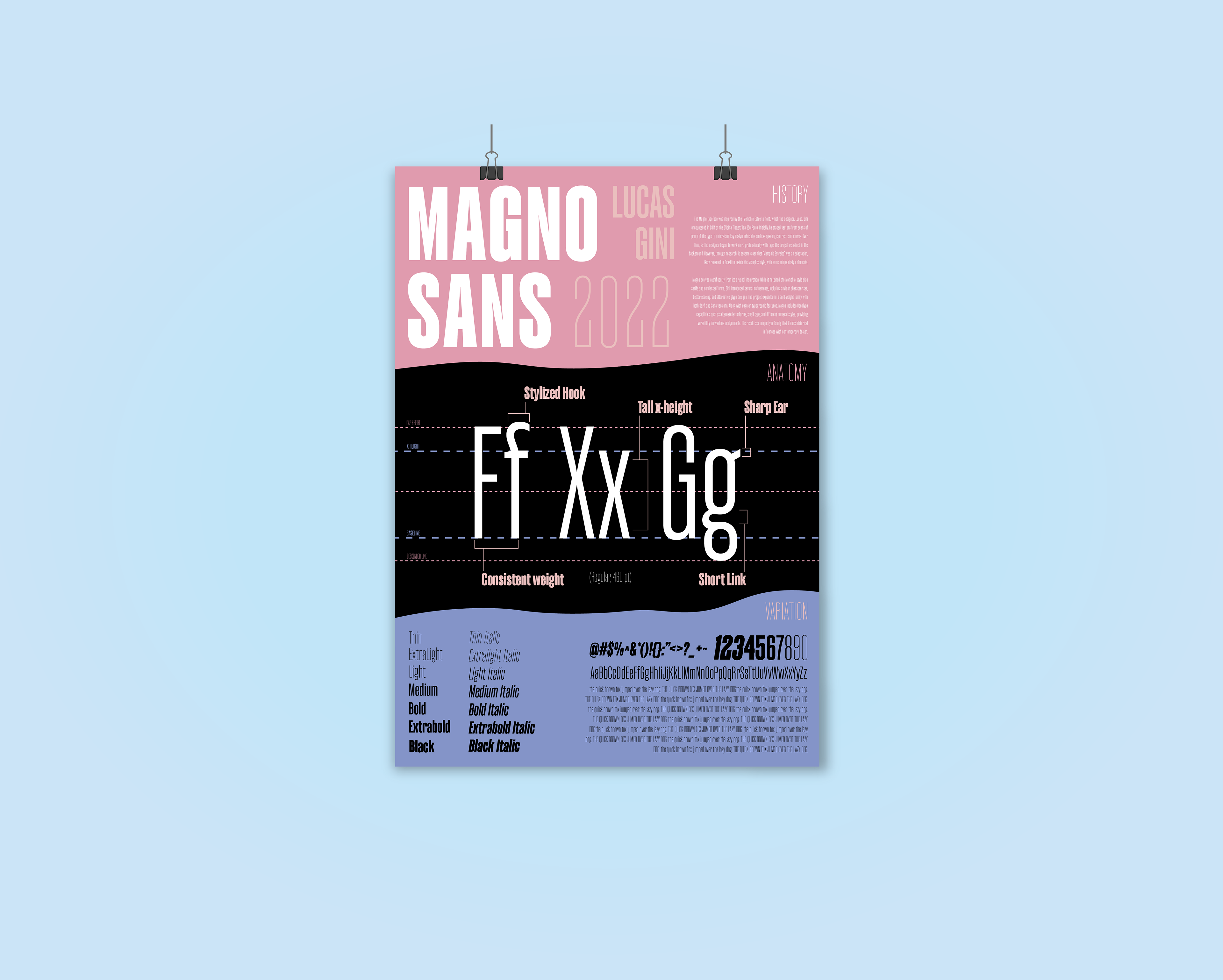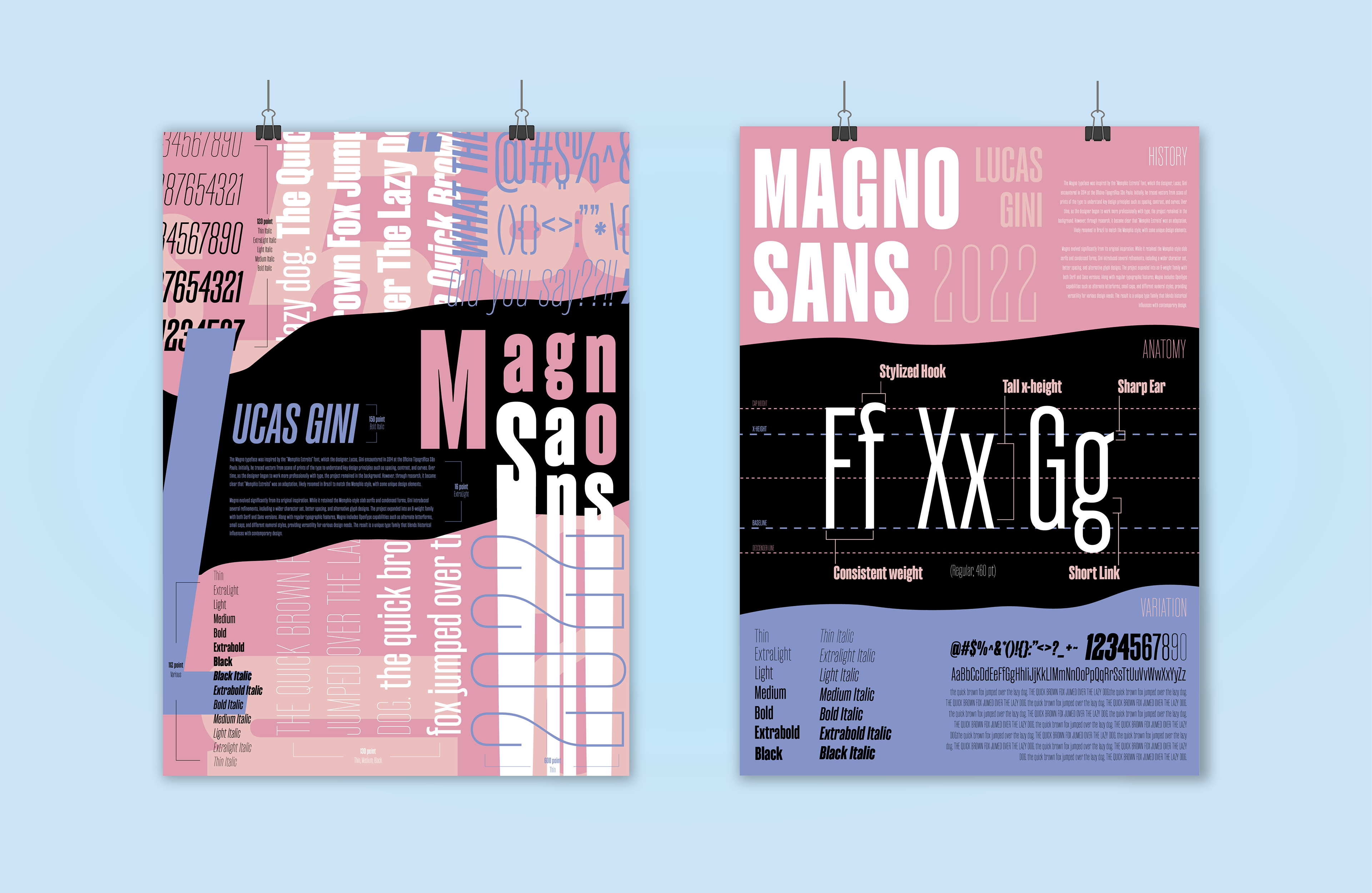 The poster was created by manipulating the font Magno Sans, using the font as background texture, with a variety of font, at the actual point size of the font. Experimental piece (top) and contemporary piece (bottom) shown.